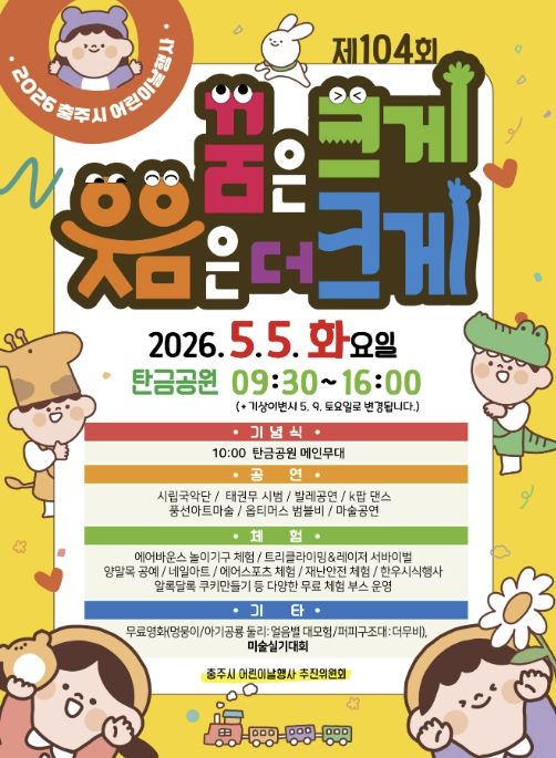 경기호연뉴스 민선기 기자 | 충주시는 오는 5월 5일 오전 9시 30분부터 탄금공원에서 ‘제104회 어린이날’을 기념하는 ‘2026 어린이날 행사’를 개최한다고 밝혔다.