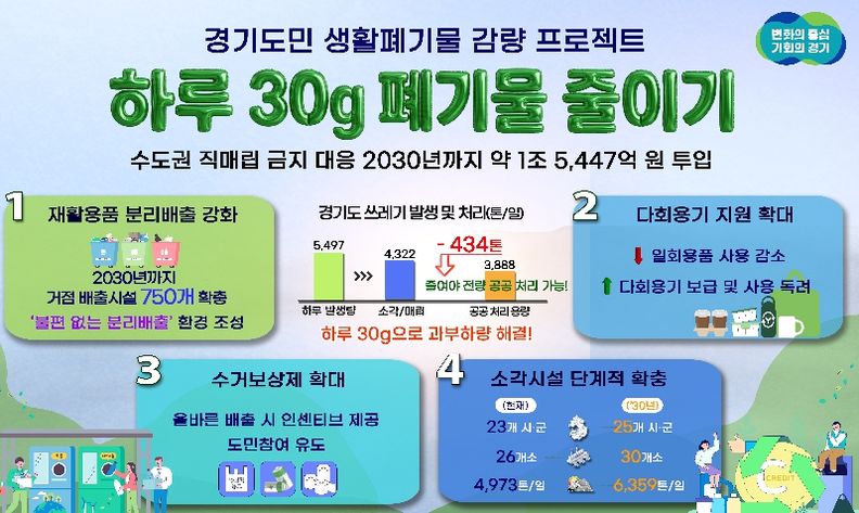 경기호연뉴스 민선기 기자 | 수도권 직매립 금지에 따른 생활쓰레기 감량을 위해 경기도가 2030년까지 5년간 약 1조 5,447억 원을 투입하는 ‘하루 30g, 도민실천형 생활폐기물 감량 프로젝트’를 추진한다.