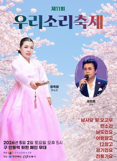 경기호연뉴스 민선기 기자 | 사단법인 국악로문화보존회가 주최․주관하는 '제11회 우리소리 축제'가 오는 5월 2일 오후 5시 안동 탈춤공원 무대에서 개최된다.