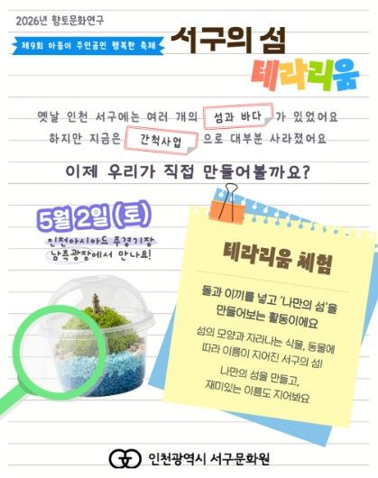 경기호연뉴스 민선기 기자 | 인천광역시 서구문화원은 오는 5월 2일 인천아시아드주경기장 남측광장에서 열리는 제9회 아동이 주인공인 행복한 축제’에서 ‘서구의 섬, 테라리움 만들기’ 체험 부스를 운영한다고 밝혔다.