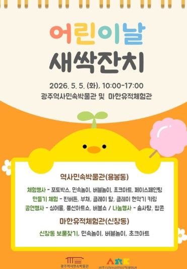 경기호연뉴스 민선기 기자 | 광주광역시역사민속박물관은 어린이날을 맞아 5일 오전 10시부터 오후 5시까지 북구 용봉동 역사민속박물관 본관과 광산구 신창동 마한유적체험관에서 ‘어린이날 새싹잔치’를 연다.