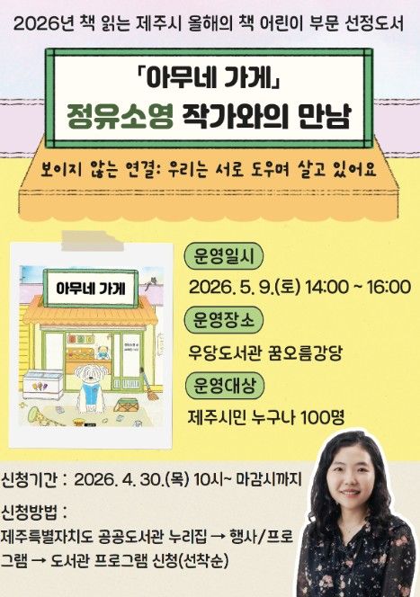먼저 5월 9일에는 ‘2026 제주시 올해의 책’ 어린이 부문 선정 도서인 ‘아무네 가게’의 저자 정유소영 작가를 초청해 강연을 진행한다.