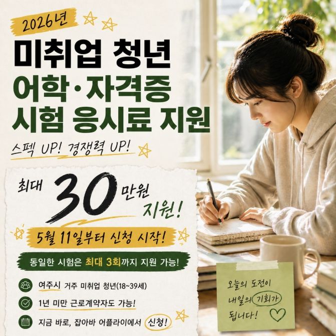지원대상은 신청일 기준 여주시에 주민등록을 두고 있는 18~39세(1986년생~2008년생)인 청년으로 시험 응시일 당시 미취업 상태여야 하며, 취업자인 경우에도 1년 미만의 단기간 노동자라면 지원이 가능하다.