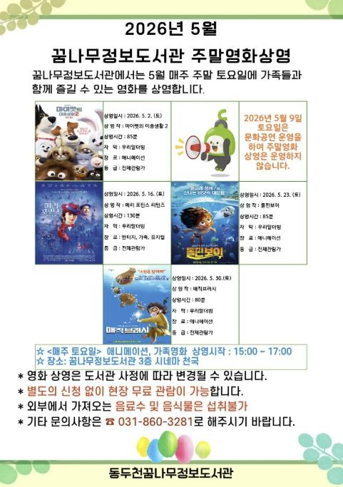 경기호연뉴스 민선기 기자 | 동두천시 도서문화사업소 정보도서관에서는 오는 5월 매주 토요일 어린이와 가족을 위한 애니매이션 및 가족영화 4편을 상영한다고 밝혔다.