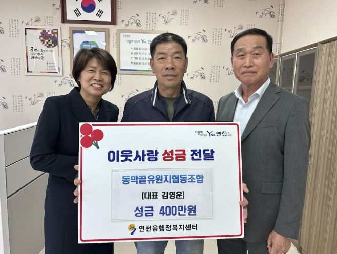 경기호연뉴스 민선기 기자 | 동막골유원지협동조합은 지난 28일 오후 4시 연천읍행정복지센터 읍장실에서 이웃돕기 후원 성금 400만 원을 기탁했다.