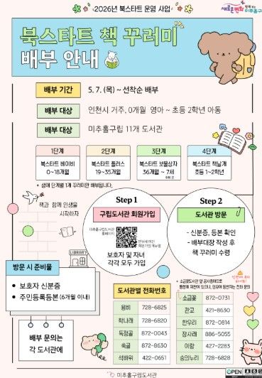아울러 미추홀 구립도서관은 책 꾸러미 배부와 연계한 ‘북 스타트 책놀이 프로그램’도 운영한다. 용비·학나래·석바위·이랑도서관 4개 관에서 매주 목요일 오전 11시부터 12시까지 ‘북 스타트 책놀이 프로그램’이 진행되며, 자세한 일정과 참여 방법은 각 도서관 누리집 공지 사항을 통해 확인할 수 있다.