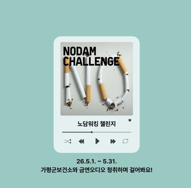 경기호연뉴스 민선기 기자 | 가평군보건소가 ‘세계 금연의 날’을 앞두고 5월 1일부터 한 달간 금연 인식 확산을 위한 ‘노담워킹 챌린지’를 진행한다. 이번 행사는 일상 속 걷기 실천과 금연 홍보를 병행해 군민들의 건강한 생활 습관 형성을 돕고자 마련됐다.