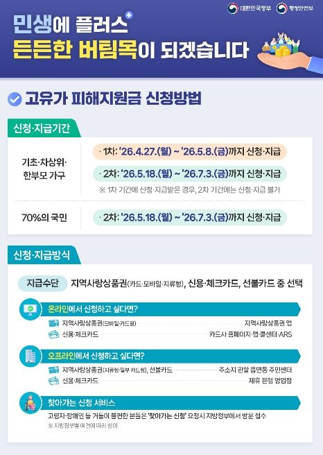 이번 1차 지원 대상은 기초생활수급자, 차상위계층, 한부모가족 등으로 신청 기간은 5월 8일까지이며 첫 주에는 출생 연도 끝자리에 따른 요일제를 적용한다. 이어 5월 18일부터는 소득 하위 70%를 대상으로 한 2차 신청이 진행될 예정이다.