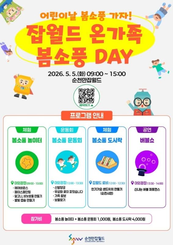 순천만잡월드 관계자는 “봄날 소풍처럼 온 가족이 함께 즐기고 어린이날의 소중한 추억을 만들 수 있도록 행사를 준비했다”며 “많은 시민들의 관심과 참여를 바란다”고 말했다.