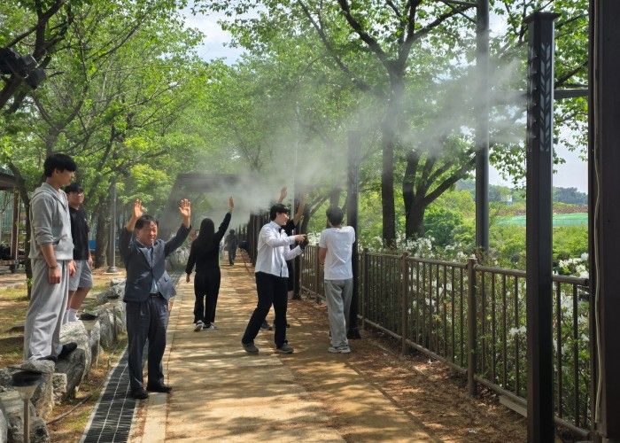 쿨링포그는 미세한 물 입자를 분사해 주변 온도를 낮추는 폭염 저감 시설이다.