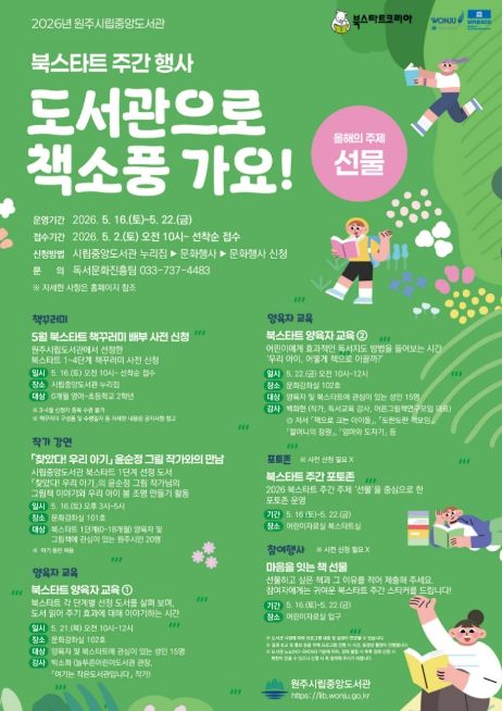 경기호연뉴스 민선기 기자 | 원주시립중앙도서관은 독서문화 확산을 위해 다음 달 16일부터 22일까지 2026 북스타트 주간 행사 ‘도서관으로 책소풍 가요!’를 운영한다.