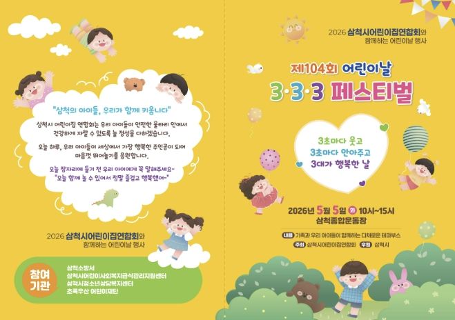 먼저 어린이날인 5월 5일 삼척시어린이집연합회 주관으로 삼척 종합운동장에서 “3초마다 웃고 3초마다 안아주고 3대가 행복한 날”이라는 주제로 ‘제104회 어린이날 3ㆍ3ㆍ3 페스티벌’을 개최한다.