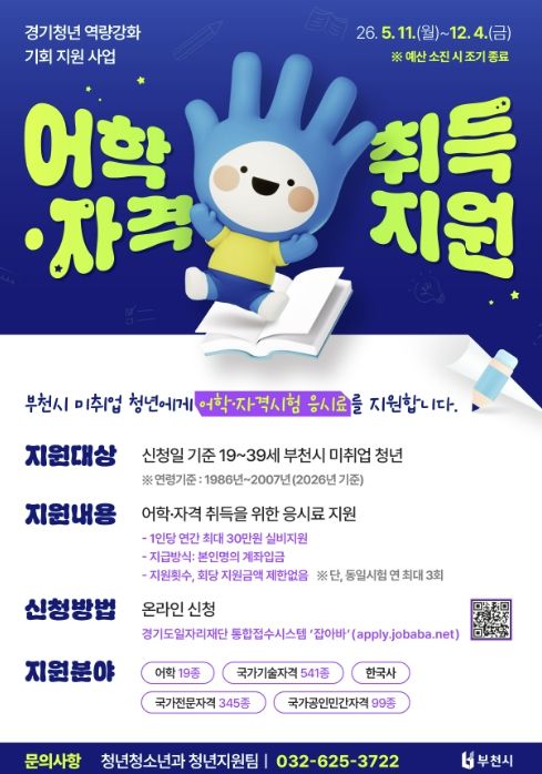 박정옥 부천시 청년청소년과장은 “이번 사업이 취업을 준비하는 청년들의 경제적 부담을 덜고 실질적인 역량 강화로 이어지길 바란다”며 “앞으로도 청년이 체감할 수 있는 맞춤형 지원 정책을 지속 추진하겠다”고 말했다.