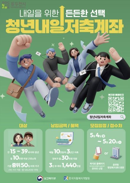 경기호연뉴스 민선기 기자 | 동두천시는 5월 4일부터 20일까지 일하는 청년들의 경제적 자립을 돕기 위해 ‘청년내일저축계좌’ 신규 가입자를 모집한다.