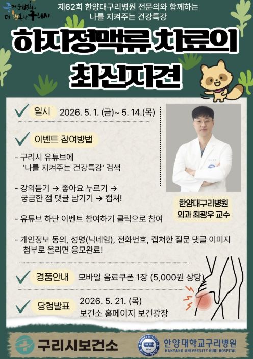 경기호연뉴스 민선기 기자 | 구리시는 5월 1일 시민의 혈관 건강 증진과 최신 의료정보 제공을 위해 시 공식 유튜브 채널 ‘구리비전’을 통해 ‘하지정맥류 치료의 최신지견’을 주제로 한 건강특강을 송출한다고 밝혔다.