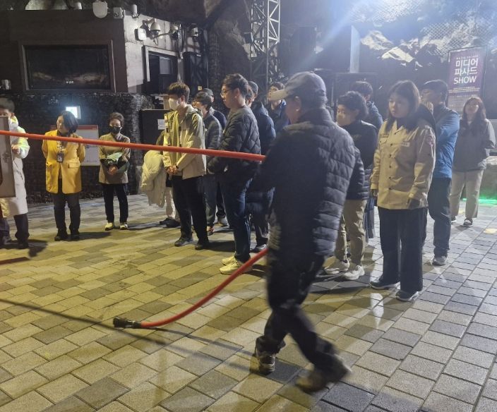 특히 대피 완료 후에는 동굴 내 소화전을 활용한 실습 교육을 집중적으로 진행했다. 참가자들은 직접 소화전 호스를 전개하고 관창을 조작해 물을 분사해 보는 등 동굴 내 화재 발생 시 초기 진압 능력을 키우는 체감형 안전 교육에 참여하여 훈련의 실효성을 높였다.