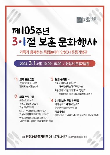 경기호연뉴스 김대엽 기자 | 안성시 안성3·1운동기념관은 3·1절 행사를 맞아 ‘제105주년 3·1절 보훈 문화행사-가족과 함께하는 독립놀이터 안성3·1운동기념관-’ 행사를 개최한다고 밝혔다.