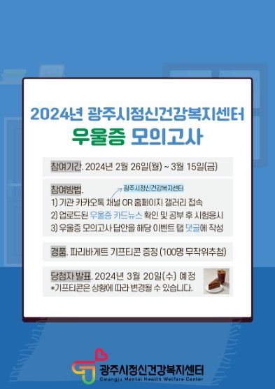 우울증 카드뉴스에는 우울증의 원인, 증상, 진단 기준, 치료 방법, 극복방법 등의 내용으로 구성돼 있고 모의고사는 이 내용을 토대로 풀 수 있는 6개의 문제로 구성돼 있다. 이벤트에 대한 자세한 내용은 광주시 정신건강복지센터 홈페이지에서 확인하고 기타 궁금한 사항은 대표 전화로 문의하면 된다.