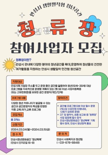 생활밀착형 청년공간 “청류장”은 안성 시내에 위치한 청년문화공간 ‘청년톡톡’ 이외에 청년들이 지리적으로 쉽게 접근할 수 있는 민간형 청년공간이다. 안성 청년들의 보다 다양한 커뮤니티를 활성화하기 위한 목적으로 안성시는 도 공모사업 선정을 통하여 도비 20,000천원을 투입해 공예, 문화·예술, 인문·교양 분야에서 총 3개소를 모집한다.