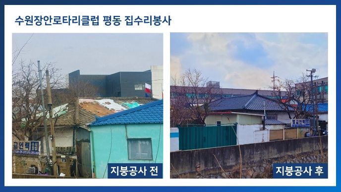 이번 주거환경 개선사업은 지난 3월 6일 평동행정복지센터와 업무협약(MOU)을 체결한 수원장안 로타리클럽(회장 변응숙)의 봉사활동으로 진행됐다. 아침부터 15명의 봉사자들이 대상 가정을 방문하여 지붕 교체 및 페인트 시공을 실시하여 쾌적한 주거공간으로 변화시켰다.