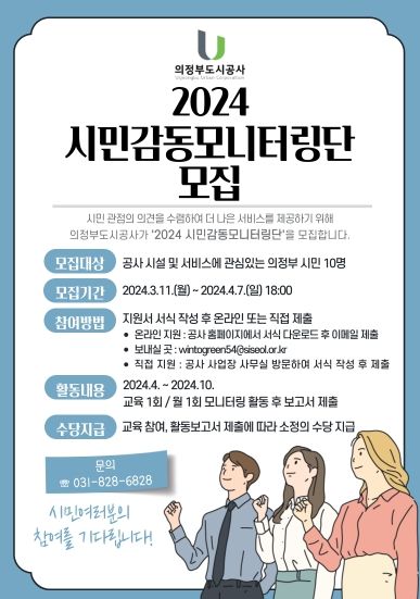 경기호연뉴스 김대엽 기자 | 의정부도시공사가 시민 관점의 의견을 수렴하고, 서비스 품질을 향상시키기 위한 2024년 시민감동모니터링단을 4월 7일 18시까지 모집한다.