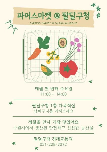 ‘2024 팔달구 파머스마켓’은 수원시에서 생산된 농산물을 판매하고 관내 농가를 홍보하고자 기획된 행사로 매월 첫 번째 수요일에 개최되고 있다.