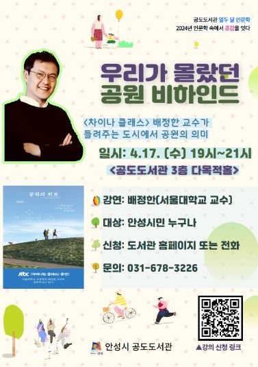 경기호연뉴스 민선기 기자 | 안성시 공도도서관은 오는 4월 17일 오후 19시, '우리가 몰랐던 공원 비하인드' 인문학 프로그램을 공도도서관 3층 다목적홀에서 진행한다.