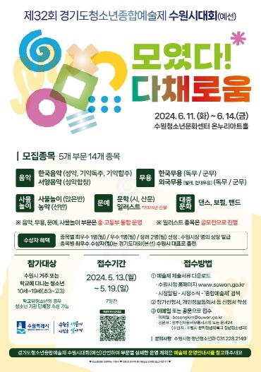 수원시는 제32회 경기도청소년종합예술제의 예선 행사인 수원시 대회 참가자를 모집한다.