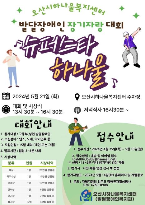 오산시하나울복지센터 강영미 관장은 “이번 장기자랑 대회를 계기로 발달장애인들이 꿈과 끼를 마음껏 펼치고 능력을 발휘해 스트레스도 해소할 수 있는 소중한 시간이 되기를 소망한다”고 말했다.