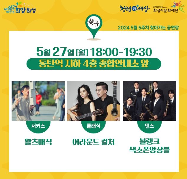 ‘동탄역 이용객을 위한 찾아가는 공연장’은 화성시, 화성시문화재단, ㈜SR이 함께 마련한 것으로, 13일, 20일, 27일에 18시부터 19시 30분까지 90분간 재즈, 뮤지컬 등 다양한 공연이 진행된다.