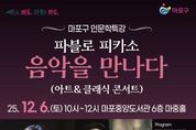 경기호연뉴스 민선기 기자 | 마포구는 오는 12월 6일 오전 10시부터 12시까지 마포중앙도서관 6층 마중홀에서 연말 인문학특강 ‘파블로 피카소, 음악을 만나다(아트&클래식 콘서트)’를 개최한다. 이번 특강은 전문 도슨트와 정상급 클래식 연주자들이 함께해 예술과 음악이 어우러진 특별한 문화 경험을 구민들에게 제공하고자 마련됐다. 프로그램은 국민대 미술이론 박사과정을 밟고 바티칸·오르세 박물관 등에서 도슨트로 활동한 이창용 도슨트가 강연을 맡아 파블로 피카소의 삶과 그의 작품 세계를 쉽고 흥미롭게 풀어낸다. 전문 해설을 통해 피카소의 예술적 감각과 시대적 배경, 작품에 담긴 메시지를 입체적으로 이해할 수 있도록 구성했다. 파블로 피카소 작품 해설과 함께 정상급 클래식 연주자들의 무대가 어우러진다. 이소란·변현정 바이올리니스트, 이신규 비올리스트, 장우리 첼리스트, 이현진 피아니스트 등 국내 음악계에서 활발히 활동 중인 연주자들이 참여해 모차르트 디베르티멘토 라장조, 쇼팽 녹턴 2번, 알렉산드로 보로딘 현악 4중주 2번 3악장, 모리스 라벨의 죽은 왕녀를 위한 파반느 등 다채로운 곡을 선보