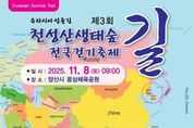 경기호연뉴스 민선기 기자 | 양산시는 11월 8일 오전 9시 웅상체육공원에서 '제3회 천성산생태숲길 전국걷기축제'가 개최된다고 밝혔다. 이번 행사는 (사)양산도시문화연구원이 주최·주관하고, 양산시와 (사)한국걷는길연합이 후원한다. ‘유라시아의 첫길, 천성산에서 유라시아로 가다’를 주제로 열리는 이번 축제는 천성산의 아름다운 숲길을 걸으며 생태와 문화, 평화의 가치를 공유하는 전국 규모의 걷기 행사다. 특히 ‘천 가지 이야기를 품은 천성산’이라는 부제를 통해 천성산의 생태적 가치와 역사문화 자원을 널리 알리고 지역민의 자긍심을 고취하는 데 의미를 두고 있다. 행사는 천성산을 사랑했던 고(故) 허영호 대장을 기리며, 대한민국 대표 산악인 최오순 산악인과 함께 걷는 특별 프로그램이 마련돼 있다. 또 웅상체육공원을 출발해 천성산생태숲길 주요 구간을 걷는 4개 코스가 마련돼 있어 남녀노소 누구나 참여할 수 있다. 참가 신청은 양산도시문화연구원 홈페이지 또는 포스터의 QR코드를 통해 가능하다. 양산시 관계자는 “천성산생태숲길은 양산의 대표적인 자연생태자원이자 시민과 관광객 모두가 즐길 수 있는 힐링 명소”라며