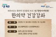경기호연뉴스 민선기 기자 | 파주보건소는 시민들의 건강한 생활을 돕고 한의약에 대한 올바른 이해를 돕기 위해 ‘한의약 건강강좌’를 개최한다. 이번 강좌는 오는 9월과 10월 두 차례에 걸쳐 문산행복센터와 운정행복센터에서 진행된다. 첫 번째 강좌는 9월 30일 10시 문산행복센터 소공연장에서 열린다. ‘성장 한의약 교육’을 주제로, 김지훈 한방공중보건의와 동국대학교 일산한방병원 심영신 한의사가 강연에 나서 학부모와 시민들에게 성장 발달에 도움이 되는 한의약적 관리 방법을 소개한다. 두 번째 강좌는 10월 16일 13시 30분 운정행복센터 다목적홀에서 개최된다. ‘한방으로 건강한 겨울나기’를 주제로, 권해진 래소한의원 한의사가 강연하며, 환절기 면역력 강화와 겨울철 건강 관리에 유용한 한의약 정보를 전달할 예정이다. 이번 강좌는 파주시민 각 50명을 대상으로 포스터 내 정보 무늬(QR코드)를 통해 신청 가능하며, 강좌를 통해 생활 속에서 실천할 수 있는 한의약적 건강관리 방법을 배우는 기회가 될 것으로 기대된다. 이한상 파주보건소장은 “시민들이 쉽게 접근할 수 있는 한의약 강좌를 통해 건강