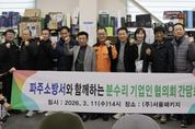 경기호연뉴스 민선기 기자 | 파주소방서는 3월 11일 오후 2시 파주시 광탄면 분수리 공장 밀집지역 관계자를 대상으로 안전점검과 간담회를 실시했다. 이날 간담회에는 김명찬 파주소방서장과 예방대책팀장, 광탄119안전센터장 등 소방 관계자, 분수리 기업인 협의회 관계자들이 참석해 공장 밀집지역 화재예방 방안을 논의했다. 분수리 자생산업단지는 약 1.07㎢ 규모에 260여 개 사업장이 밀집해있으며. 약 2천여 명의 근로자가 근무하고 있어 평소 화재예방과 초기 대응체계 강화가 중요한 곳이다. 이에 따라 소방서는 관계자와의 소통을 바탕으로 현장 중심 예방활동을 이어가고 있다. 이날 간담회에서는 산업단지 일반현황과 주요 화재 위험요인을 공유하고, 공장 밀집지역의 특성을 반영한 화재예방 방안을 논의했다. 이후 공단 일대 현지 시찰을 통해 주요 위험요소를 직접 확인하고, 화재 피해 저감 방안을 모색했다. 또 기업 관계자들에게 소화기와 단독경보형감지기 사용법, 전기화재 주의사항, 콘센트 화재 방지 스티커 활용법 등을 안내하고, 파주 관내 기업 대상 오픈채팅방 운영을 소개하며 화재예방 정보 전달 체계도 함께 설명했다. 김명찬 파