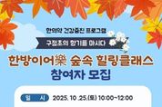 경기호연뉴스 민선기 기자 | 파주보건소는 시민들의 건강한 삶을 위한 한의약 건강 증진 프로그램인 ‘한방이어락(樂) 숲속 치유교실(힐링 클래스)’을 오는 25일 10시부터 12시까지 율곡수목원에서 운영한다. 이번 프로그램은 자연 속에서 가족이 함께 건강을 되돌아보고, 숲에서의 명상과 호흡을 통해 스트레스를 해소하고자 기획됐다. 참가자들은 수목원의 맑은 공기와 아름다운 풍경 속에서 지친 몸과 마음을 회복하는 시간을 갖게 된다. 주요 내용은 ▲구절초 숲길 산책 ▲자연 속에서 가족과 추억 만들기 ▲구절초 차 마시기 등 구절초를 주제로 한 다양한 활동으로 구성되어 있다. 신청은 파주시 평생교육포털 누리집(lll.paju.go.kr)을 통해 가능하며, 가족 단위로(4~6가구, 총 20여 명) 선착순 모집한다. 단, 신청 가구가 많을 경우 3대 가족을 우선 선발한다. 이한상 파주보건소장은 “자연과 함께하는 치유 프로그램을 통해 가족 간 유대감을 높이고, 건강한 생활 습관을 기를 수 있는 계기가 되길 바란다”라며 “많은 시민들의 적극적인 참여를 기대한다”라고 밝혔다.