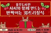 경기호연뉴스 민선기 기자 | 김포시 풍무도서관에서 초등학생을 대상으로 ‘사서와 함께 만드는 반짝이는 3D트리장식’을 오는 12월 10일 오후 4시부터 6시까지 운영한다. 이번 프로그램은 수강생의 학년에 따라 제작 도구의 난이도와 창작물이 구분되며, 참여 학생의 수준에 맞춘 맞춤형 체험활동으로 운영된다. 3D펜을 활용한 제작 경험을 통해 공간·입체 감각을 향상시키는 동시에 연말 크리스마스 시즌의 특색있는 분위기를 느낄 수 있다. 특히 풍무도서관 특화담당 사서가 직접 프로그램을 진행함으로써 안전하고 체계적인 지도가 이뤄질 것이다. 참여 신청은 11월 25일 오전 10시부터 풍무도서관 홈페이지에서 가능하며, 초등학생(1~6학년) 총 12명을 선착순 모집한다.