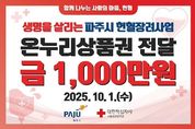경기호연뉴스 민선기 기자 | 파주시는 지난 1일 대한적십자사 서울중앙혈액원에 1천만 원 상당의 헌혈장려지원금 상품권을 전달했다. 시는 안정적인 혈액 공급 기반을 마련하고 지역사회 내 헌혈 참여문화를 확산하기 위해 지난달 헌혈추진협의회를 구성 회의를 개최했으며, 회의 결과에 따라 관내 헌혈자 대상 인당 1만 원 상당의 온누리상품권을 지급할 예정이다. 특히 파주시는 말라리아 헌혈 제한 지역으로, 관내 헌혈의집이 없어 헌혈버스를 통해서만 헌혈이 가능하고 동계기간인 11월~3월에 한해 전혈헌혈이 허용되는 등 여러 제약이 있다. 이러한 어려운 여건 속에서도 시민들의 헌혈 참여를 확대하기 위해, 국내 말라리아 헌혈 제한 지역 중 최초로 헌혈장려금을 지원하게 됐다. 이한상 파주보건소장은 “헌혈장려지원금 지급이 혈액 수급 안정화와 헌혈 참여문화 확산에 기여하는 계기가 되길 기대한다”라고 밝혔다.