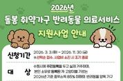 경기호연뉴스 민선기 기자 | 수원특례시는 돌봄 취약가구의 반려동물 양육 부담을 덜고 동물복지를 강화하기 위해 ‘2026년 돌봄 취약가구 반려동물 의료서비스 지원사업’을 추진한다. 지원 대상은 수원시에 주민등록을 두고 실제 거주하며 본인 명의로 반려동물을 등록해 기르는 기준중위소득 85% 이하 가구다. 저소득층, 중증장애인, 한부모가정, 다문화가정, 1인가구 등이 포함된다. 경기도 공공입양기관에서 국가봉사동물을 입양한 경우는 소득과 관계없이 지원한다. 보호자 1명당 2마리까지 신청할 수 있다. 동일 동물은 ‘의료·돌봄·장례 지원’ 또는 ‘노령동물 종합건강검진’ 중 한 가지 항목만 선택해 지원한다. 의료·돌봄·장례 지원은 마리당 최대 16만 원(초과비용 자부담), 노령동물 종합건강검진은 최대 32만 원(초과비용 자부담)까지 지원한다. 노령동물 검진은 2019년 12월 31일 이전 출생한 반려동물에 한한다. 의료지원에는 백신접종, 중성화수술, 기본검진·치료비 등이 포함되고, 돌봄 위탁비와 장묘 서비스도 지원한다. 노령 반려동물은 종합건강검진을 받을 수 있으며 모든 서비스는 관내 업체를 이용해야 한다. &