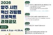 경기호연뉴스 민선기 기자 | 양주시가 시민이 일상에서 겪는 사회문제를 직접 발굴하고 해결 방안을 모색하는 ‘2026년 양주 시민 혁신 리빙랩 프로젝트’ 공모를 오는 23일까지 진행한다. 이번 공모는 시민 참여를 기반으로 지역사회 문제 해결 방안을 도출하기 위해 마련됐다. 양주시에 거주하거나 직장·학교 등 생활권을 둔 시민이면 누구나 참여할 수 있다. 참여는 주제안자를 포함한 4인 이상으로 구성된 팀 단위로 가능하며, 공감토크(현장심사)와 과제 선정 이후 진행되는 워크숍, 성과공유회(12월 예정) 등에 참여해야 한다. 공모 주제는 청소년·청년, 탄소중립, 도시재생, 1인 가구, 반려동물 문화, 디지털 격차 등 지역사회가 직면한 다양한 사회문제 해결과 관련된 아이디어다. 접수된 제안은 사회적 가치와 효과성·창의성, 실현 가능성 등을 기준으로 제안심사실무위원회 심사와 공감토크 현장심사를 거쳐 최종 과제로 선정된다. 최종 선정된 2개 팀은 5월부터 11월까지 약 7개월간 퍼실리테이터(활동촉진자)와 함께 워크숍에 참여하며, 문제 정의부터 개선 방향 도출, 시범사업 추진까지 단계별 프로젝트를 수행