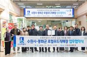 경기호연뉴스 민선기 기자 | 수원특례시와 봉화군농어업회의소는 19일 수원시청에서 로컬푸드 입점 협약을 체결했다. 협약식은 이날 시청 별관 앞에서 열린 ‘봉화 수원 캠핑장 개장 기념 농산물 직거래장터’에서 진행됐다. 수원시는 인구소멸 위기 지역 농가의 안정적 판로 확보를 지원하고, 시민에게 신선한 지역 농산물을 제공할 예정이다. 협약식에는 남상은 수원시 농업기술센터 소장, 김주익 봉화군농어업회의소 회장, 신종길 봉화군 농업기술센터 소장 등이 참석했다. 봉화 수원 캠핑장 개장 기념 농산물 직거래장터에는 수원시·봉화군·수원농협·하나로마트 수원점이 참여했다. 수원로컬푸드직매장은 상추·배추·표고버섯 등 농산물을, 봉화군은 사과·생강·고구마·마 등 주요 특산물을 판매했다. 하나로마트 수원점은 감, 인삼, 대추, 새우젓, 멸치 등 통영·사천·김천 등의 농산물을 판매했다. 방문객에게 정다미 500g 200개와 장바구니 200개를 제공하는 행사도 진행했다. 수원시 관계자는 “수원시민에게 신선한 로컬푸드를 제공하고, 인구소멸 위기 지역 농가와 상생 협력할 수 있는 기반을 마련했다”며 “지역 농가와 시민