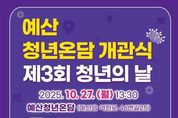 경기호연뉴스 민선기 기자 | 예산군은 오는 10월 27일 오후 1시 30분, 예산읍 주교리에 위치한 청년거점공간 ‘예산청년온담’에서 개관식과 제3회 청년의 날 기념행사를 개최한다고 밝혔다. 이번 행사는 청년 인구 감소와 지역 소멸 위기에 대응하기 위해 조성된 청년 거점공간의 개관을 기념하기 위해 마련됐으며, 당초 법정기념일(9월 셋째 주 토요일)에 예정됐던 청년의 날 행사가 수해로 연기됨에 따라 두 행사를 함께 진행한다. 행사는 식전공연을 시작으로 △개관식 △청년의 날 기념식 △청년특강 순으로 진행되며, 지역 청년들이 대거 참석할 예정이다. ‘예산청년온담’은 청년 전용 복합공간으로, 연면적 2,092.96㎡, 지하 1층·지상 2층 규모로 조성됐으며, 내부에는 북카페, 공유오피스, 스터디룸, 강의실, 공유주방 등 다양한 공간이 마련돼 있어 청년들의 창업·학습·휴식·소통이 어우러지는 열린 플랫폼으로 운영될 예정이다. 특히 이번 행사에는 서울대학교병원 강남센터 정신건강의학과 윤대현 교수가 초청돼 ‘청년, 단단한 멘탈로 나아가다 – 불안을 용기로 바꾸는 마음 근육 키우기’를 주제로 특강을 진행하며, 윤 교