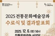 경기호연뉴스 민선기 기자 | 광주문화재단 전통문화관은 오는 12월 6일 오후 2시 전통문화관에서 광주광역시 무형유산 보유자와 수강생이 함께하는 ‘2025 전통문화예술강좌 수료식 및 결과발표회’를 개최한다. 이번 행사는 상·하반기 총 26개 강좌에서 강좌별 15회차 중 70% 이상 출석한 수강생에게 수료증을 수여하고, 무형유산 기·예능 보유자 및 전문강사에게 직접 배운 기량을 선보이기 위해 마련됐다. 수료식은 상·하반기 수강생 수료증 전달식에 이어 1부 기능분야(탱화, 민화, 전통음식) 발표회, 2부 예능분야(판소리, 판소리고법, 가야금병창) 발표회 순으로 진행된다. 2025년 전통문화예술강좌 수강생은 총 269명이다. 상반기 강좌에서는 수강생 140명 중 122명, 하반기 강좌에서는 수강생 129명 중 118명이 수료증을 받을 예정이다. 1부 기능분야 발표회에서는 광주광역시 남도의례음식장 최영자 보유자 강좌의 조아란 수강생, 이애섭 보유자 강좌의 김은수 수강생, 민경숙 보유자 강좌의 안건상 수강생이 전통음식 대표 작품을 소개한다. 또한 광주광역시 탱화장 송광무 보유자가 진행한 탱화 강좌의 김하정 수
