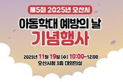 경기호연뉴스 민선기 기자 | 오산시는 오는 19일 ‘아동학대예방의 날’과 ‘아동학대예방주간’을 맞아 기념행사 및 온·오프라인 캠페인을 실시한다고 12일 밝혔다. 행사는 19일 오전 10시부터 12시까지 오산시청 대회의실에서 진행되며, ▲1부 아동학대예방의 날 기념식 식전공연, 유공자 표창 시상, 퍼포먼스, ▲2부 부모교육 특별강연으로 구성된다. 특별강연은 리플러스 인간연구소 박재연 소장이 ‘부모를 위한 건강한 대화방법’을 주제로 진행한다. 매년 11월 19일은 아동학대 예방과 방지에 대한 사회적 관심을 높이기 위해 제정된 법정기념일로, 오산시는 매년 기념식과 강연, 캠페인 등을 통해 아동학대 예방의 중요성을 알리는 다양한 활동을 추진해오고 있다. 시는 이달 25일까지 온라인 릴레이 캠페인도 함께 진행한다. 오산시민 누구나 SNS에 아동학대예방 메시지 또는 관련 사진을 업로드해 참여할 수 있다. 또한 11월 24일에는 시청 인근 주요 교차로에서 시민 대상 오프라인 홍보 캠페인을 실시해 아동학대 예방 인식 제고에 나설 예정이다. 박현주 아동복지과장은 “이번 행사가 아동학대 예방의 중요성을 되새기고 아이